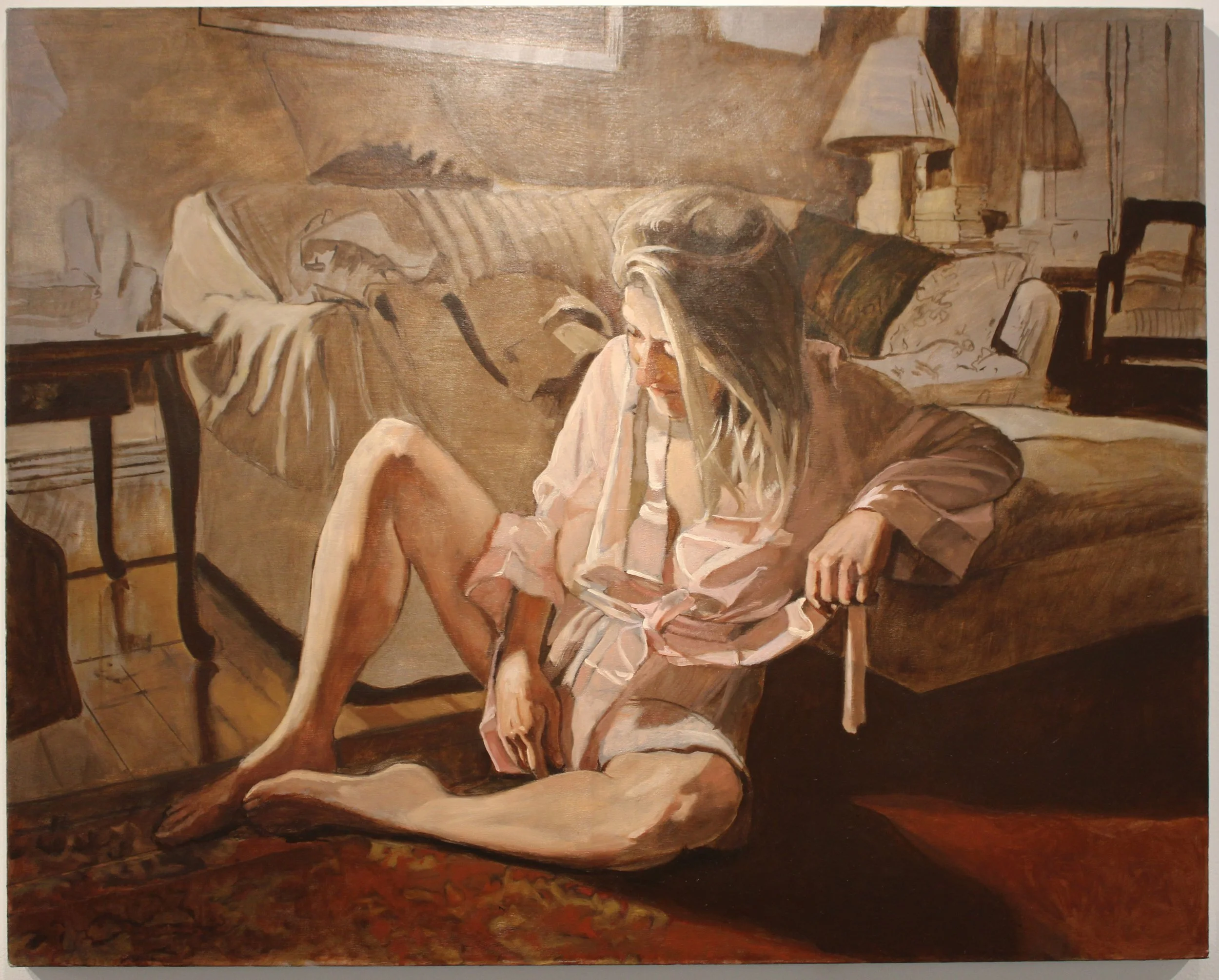 It was self- portraiture and long hours viewing himself in a mirror isolated in the studio, daily trips on the commuter rail and time spent tucked away reading and the desire to escape the ever present demands and pressures of the outside world which led him to consider the theme of being alone as the focus of his work His experience in portraiture is incorporated into a narrative, a narrative veiled in a degree of ambiguity which may suggest themes of intimacy, religion, and the male gaze. This is supported by a light that in addition to its formal functions contributes to the narrative of the painting whether quietly slipping through an open window or providing the inescapable glare of a subway car.