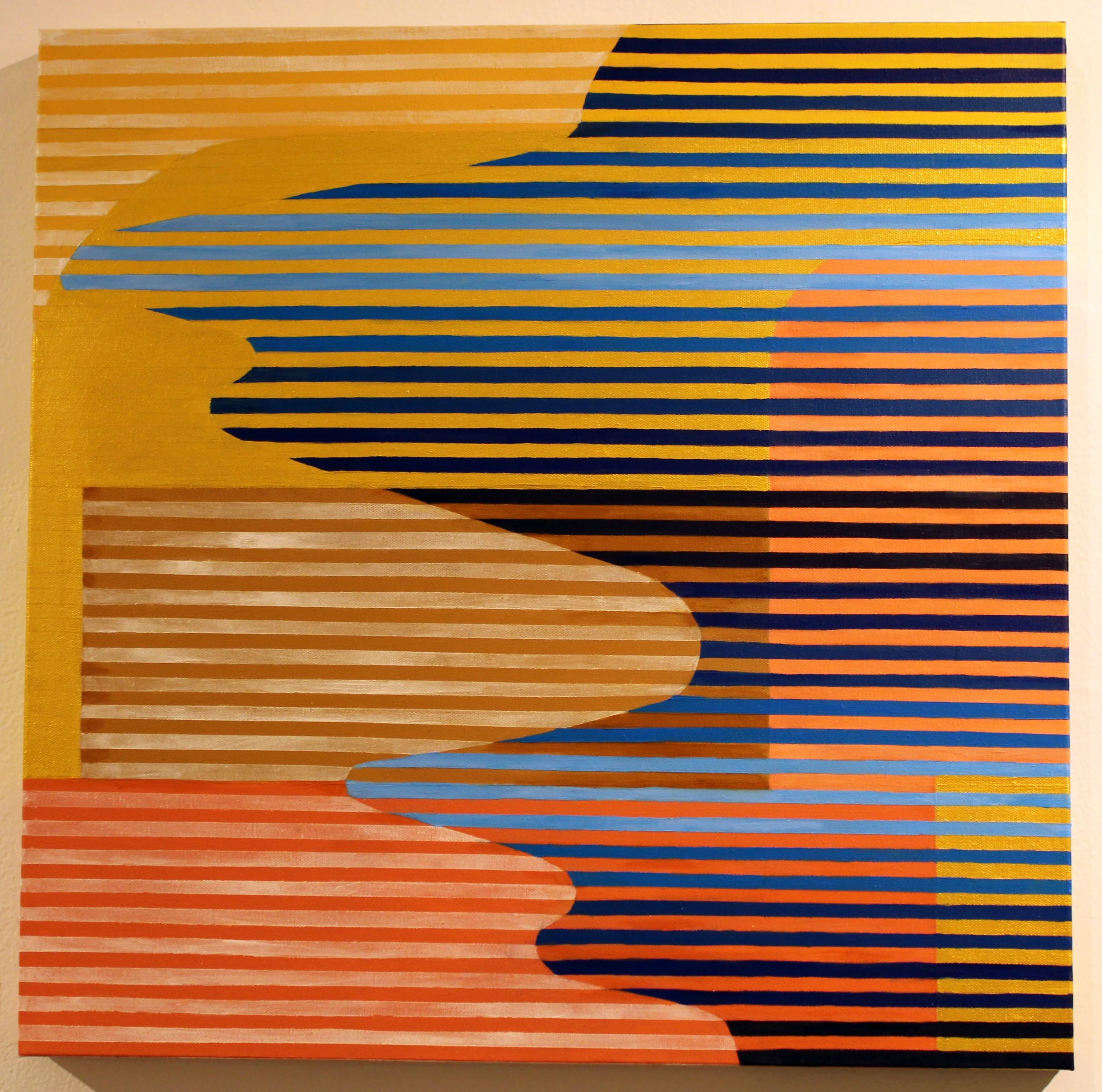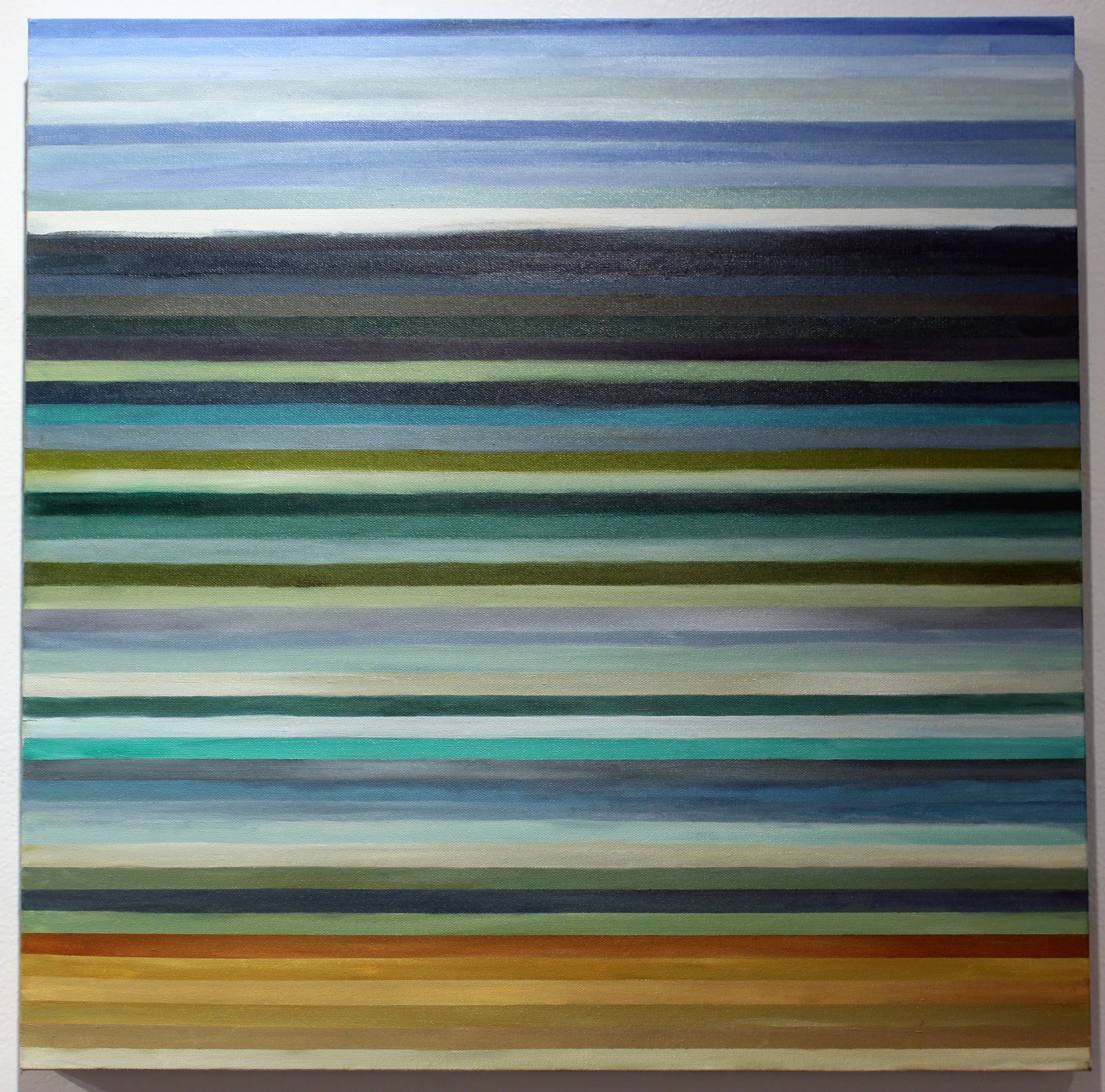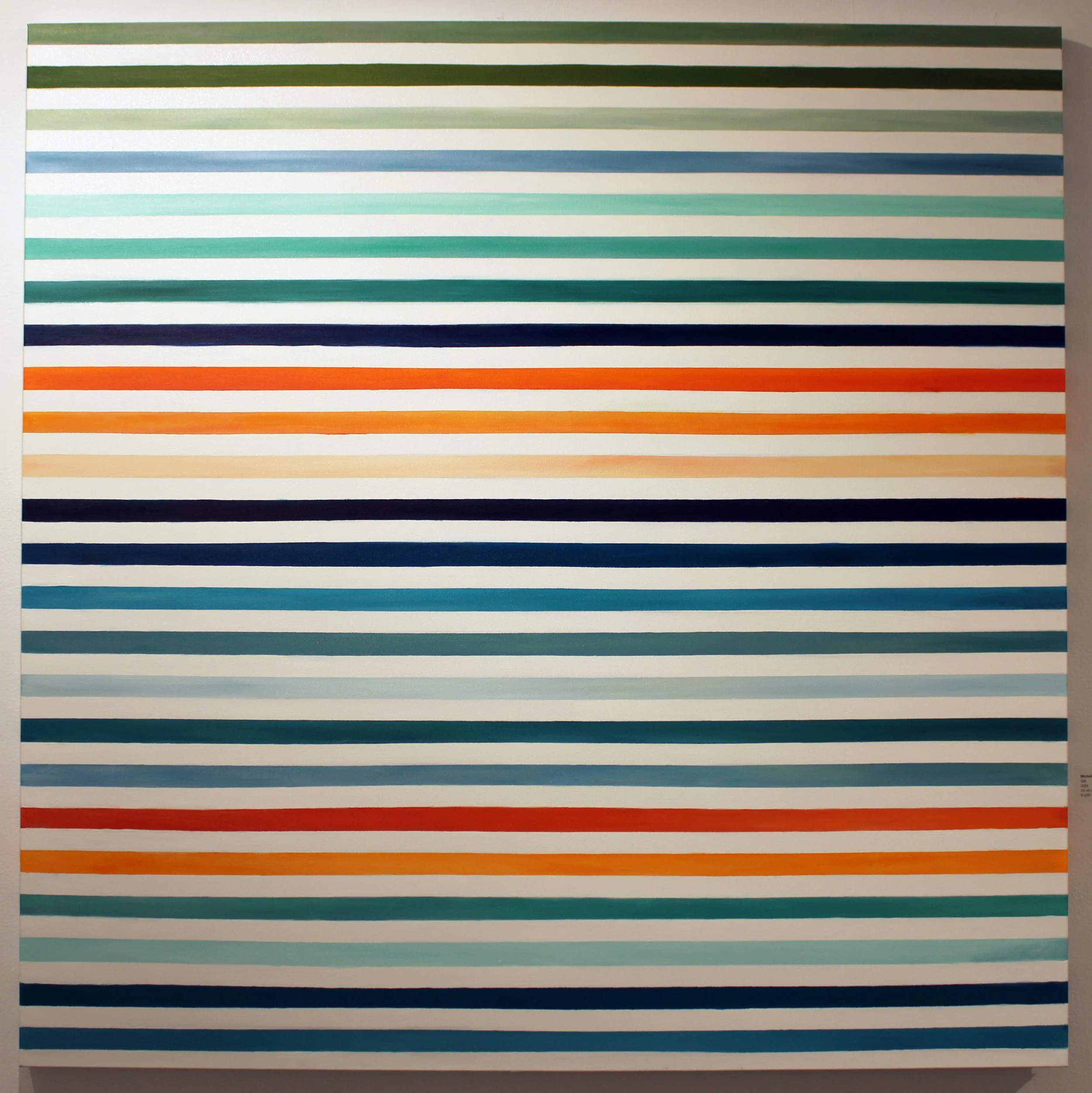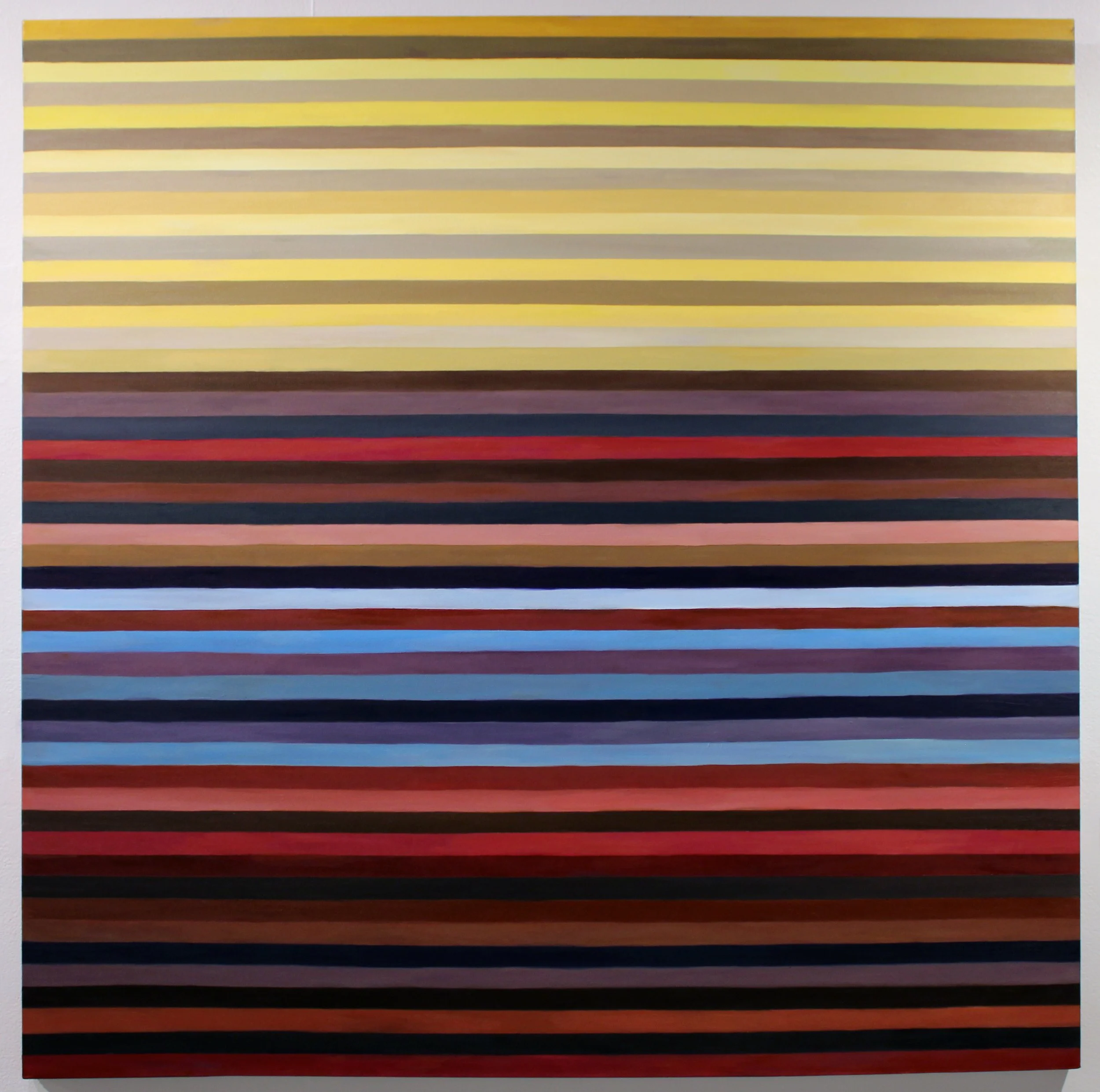 For my paintings, I have combined both of these methods, using stripes, but stripes that are uniform, and iInstead of interpreting them proportionally in size, I have repeated colors based on an average of how often they appear. I have also played with parameters by not keeping the stripes precise (using both taping methods and freehand) , using color theory combinations and imperfections to keep movement in the canvas, or arranging them in an order that reflects the original image, as in “Chair 5”.