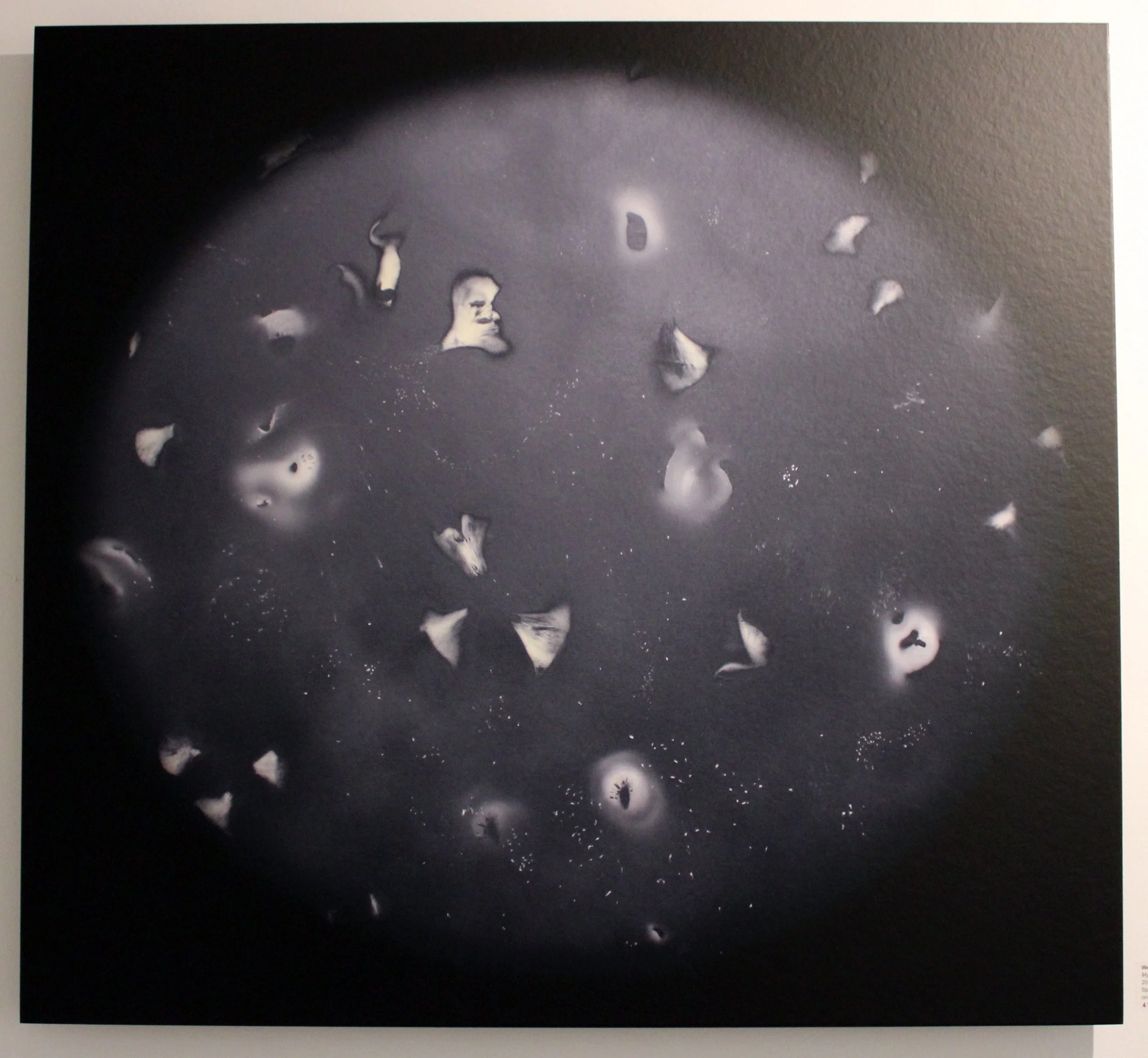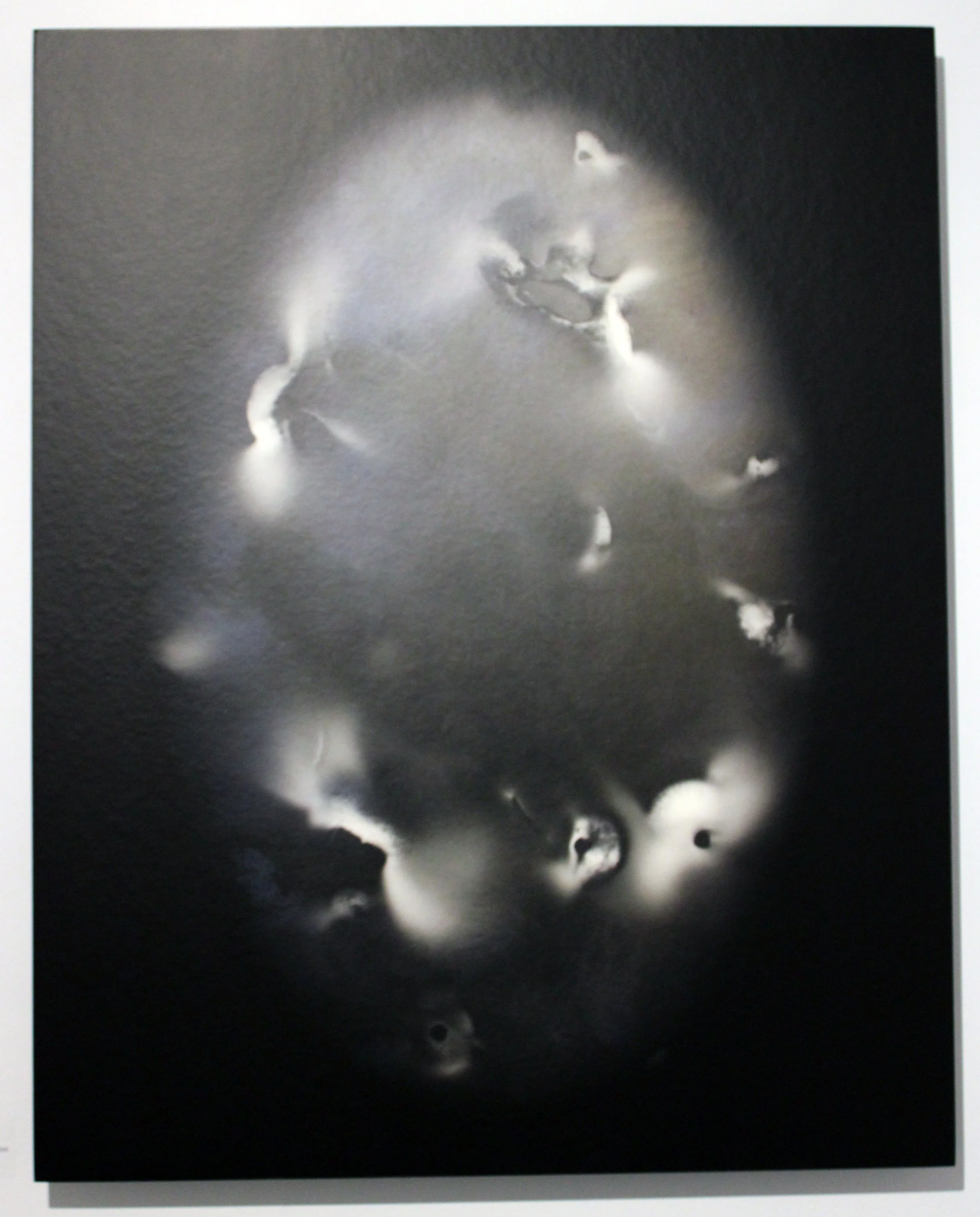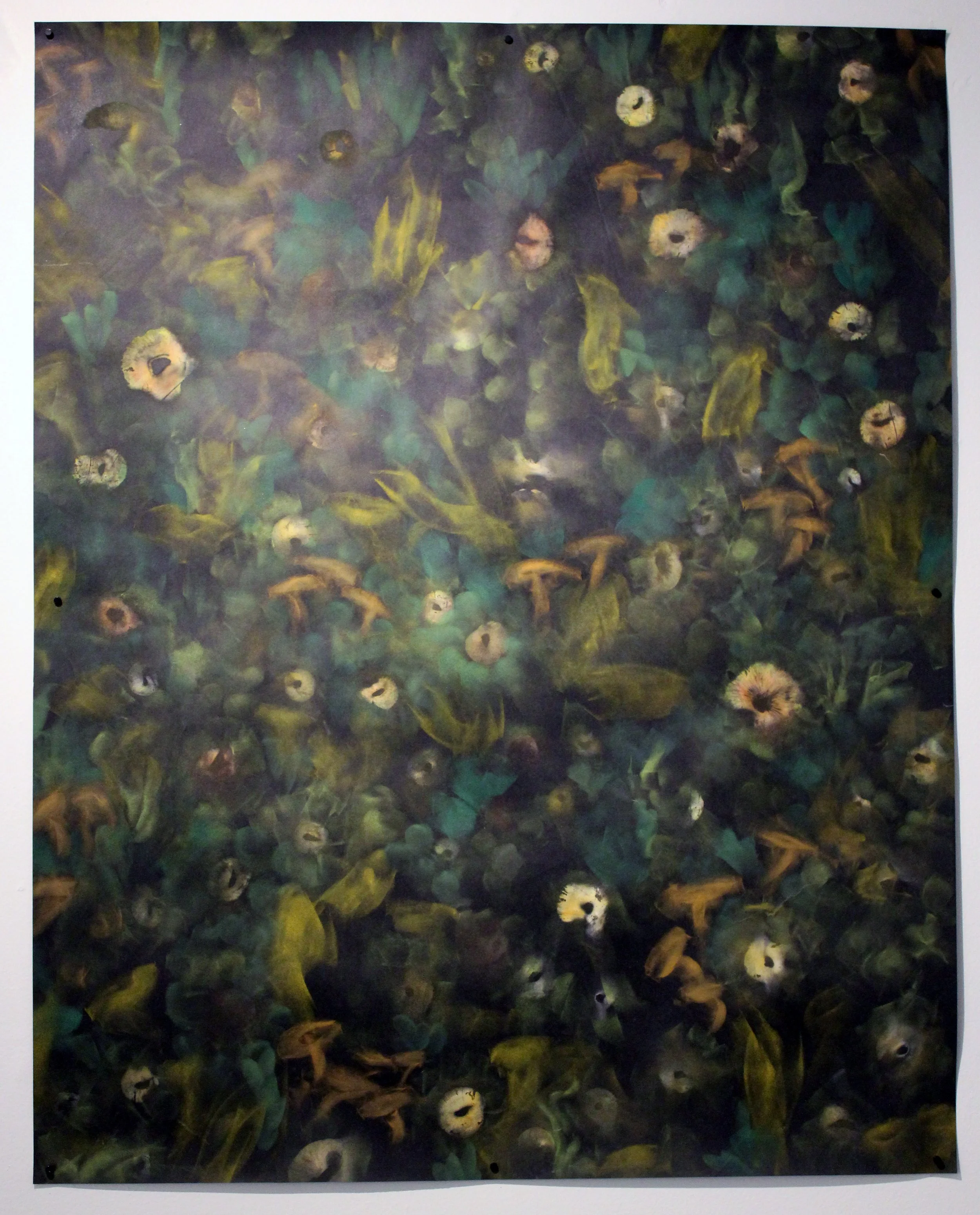 The pieces in this exhibition are a selection of works from a series called myceliology, a combination of mycology, the study of the fungal kingdom, and mycelium, the threads of connection underground everywhere we step. Myceliology is an aesthetic exploration of the Fungal Kingdom. To understand this weird and wonderful world of interconnectedness I turned to mycologist Paul Stamets, anthropologist Anna Lowenhaupt Tsing, biologist Merlin Sheldrake, and food mycophile, Eugenia Bone. The Fungal Kingdom is a powerful presence in the circle of life, is considered nature's internet or wood wide web, and is linked to all of Earth's species. When I began playing with mushroom spores I found their marks crossed terrestrial, celestial, and aquatic realms. I remember thinking they were inviting me to participate.