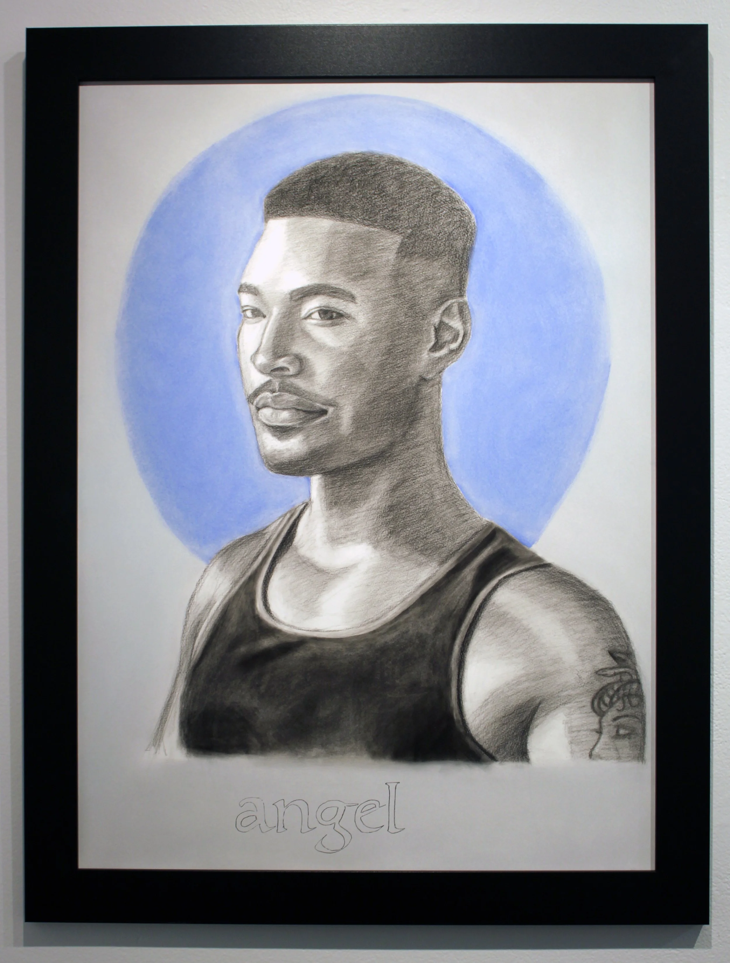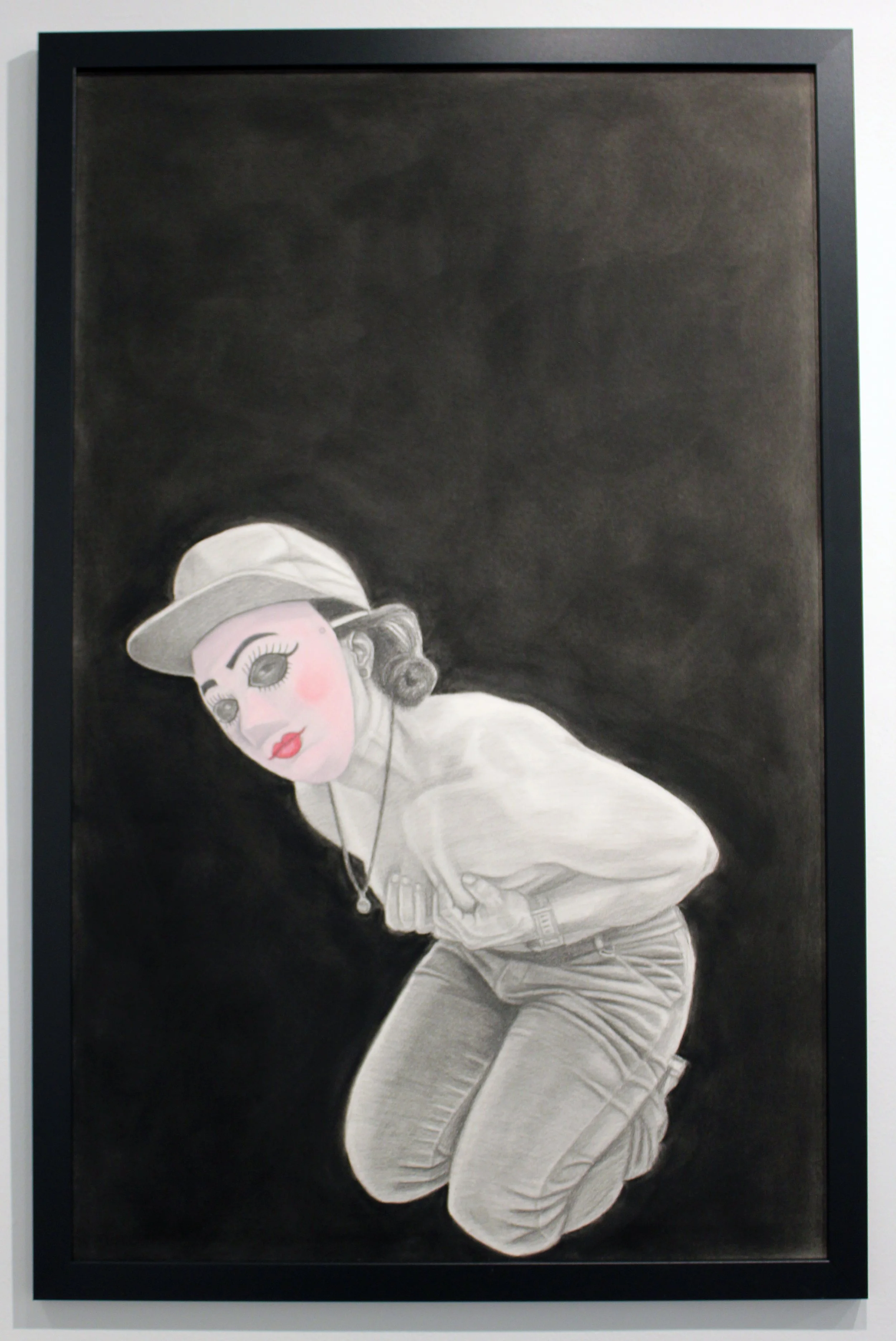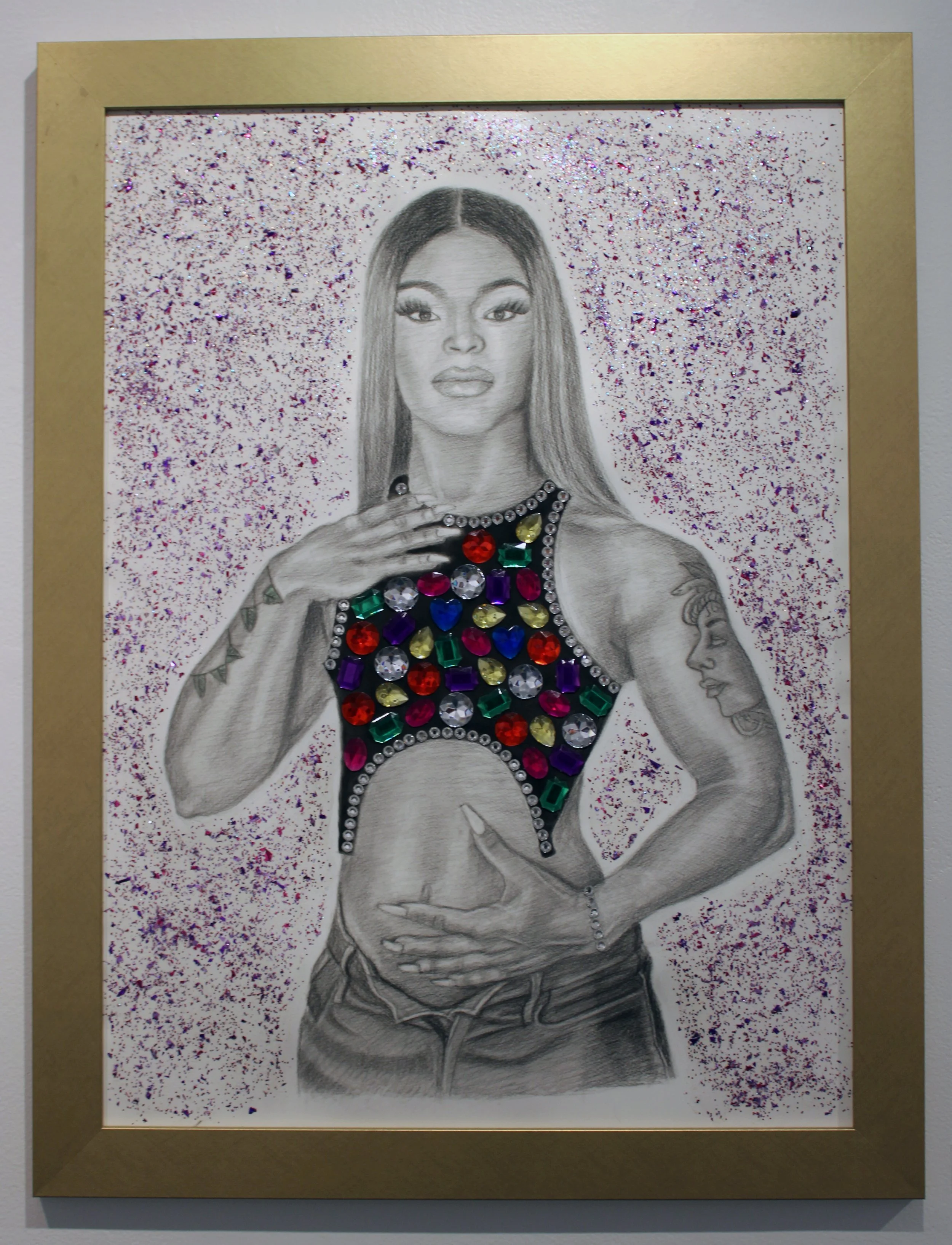Charcoal, panpastel, glitter paint, and rhinestones on Arches paper