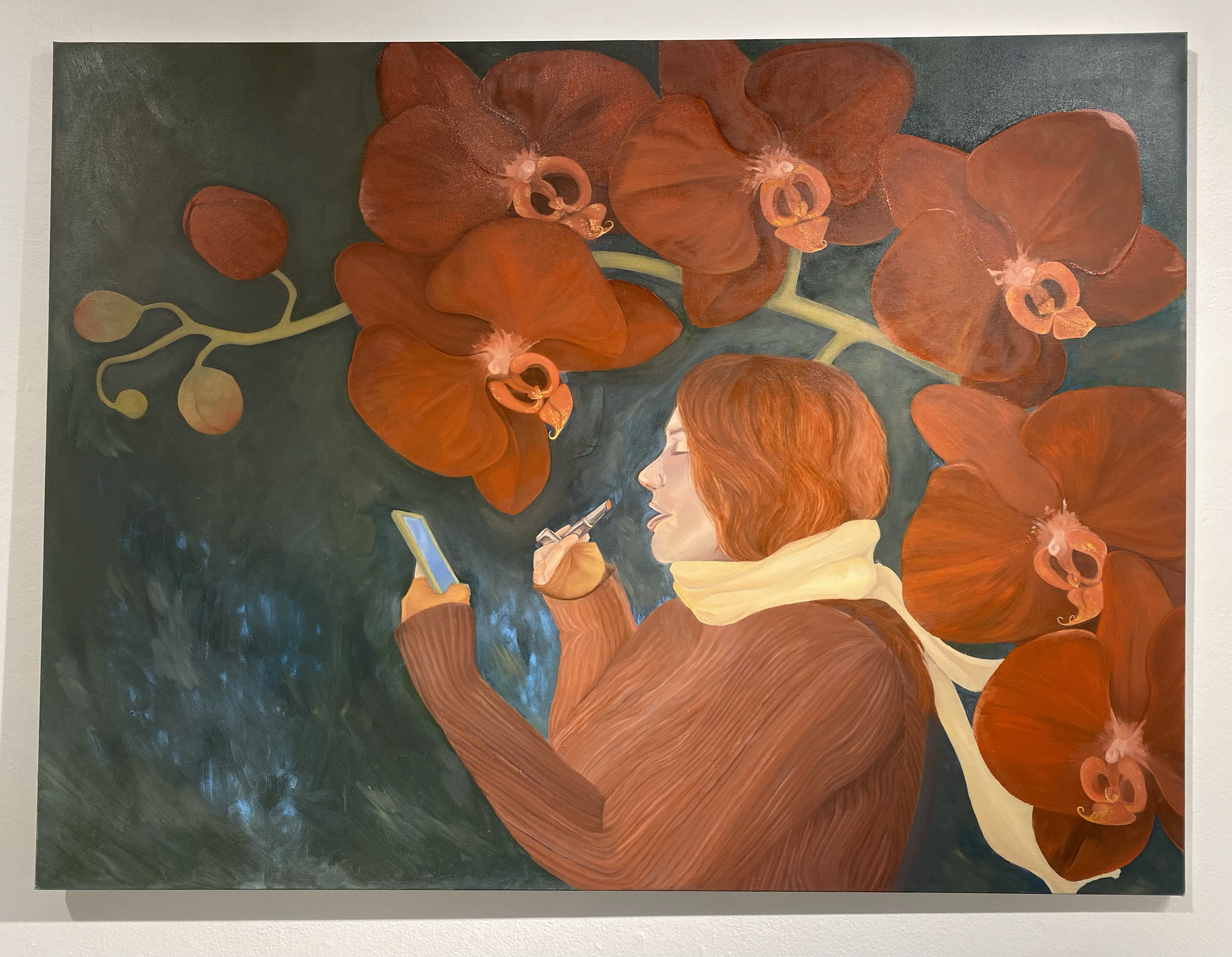 This painting explores personal and social growth through the symbolism of the orchid. A towering, vivid orchid stretches across the canvas, its blossoms reaching outward. Beneath it, a woman strides confidently, applying lipstick, her red hair blending seamlessly into the flower’s stem. Her scarf billows behind her, suggesting motion and freedom. Drawing from the orchid’s historical associations with beauty, strength, and rarity, In Bloom reclaims these symbols to challenge traditional notions of femininity. Rather than fragile or ornamental, the woman embodies the dynamic force of nature—flourishing on her own terms, representing autonomy, transformation, and modern feminist empowerment.