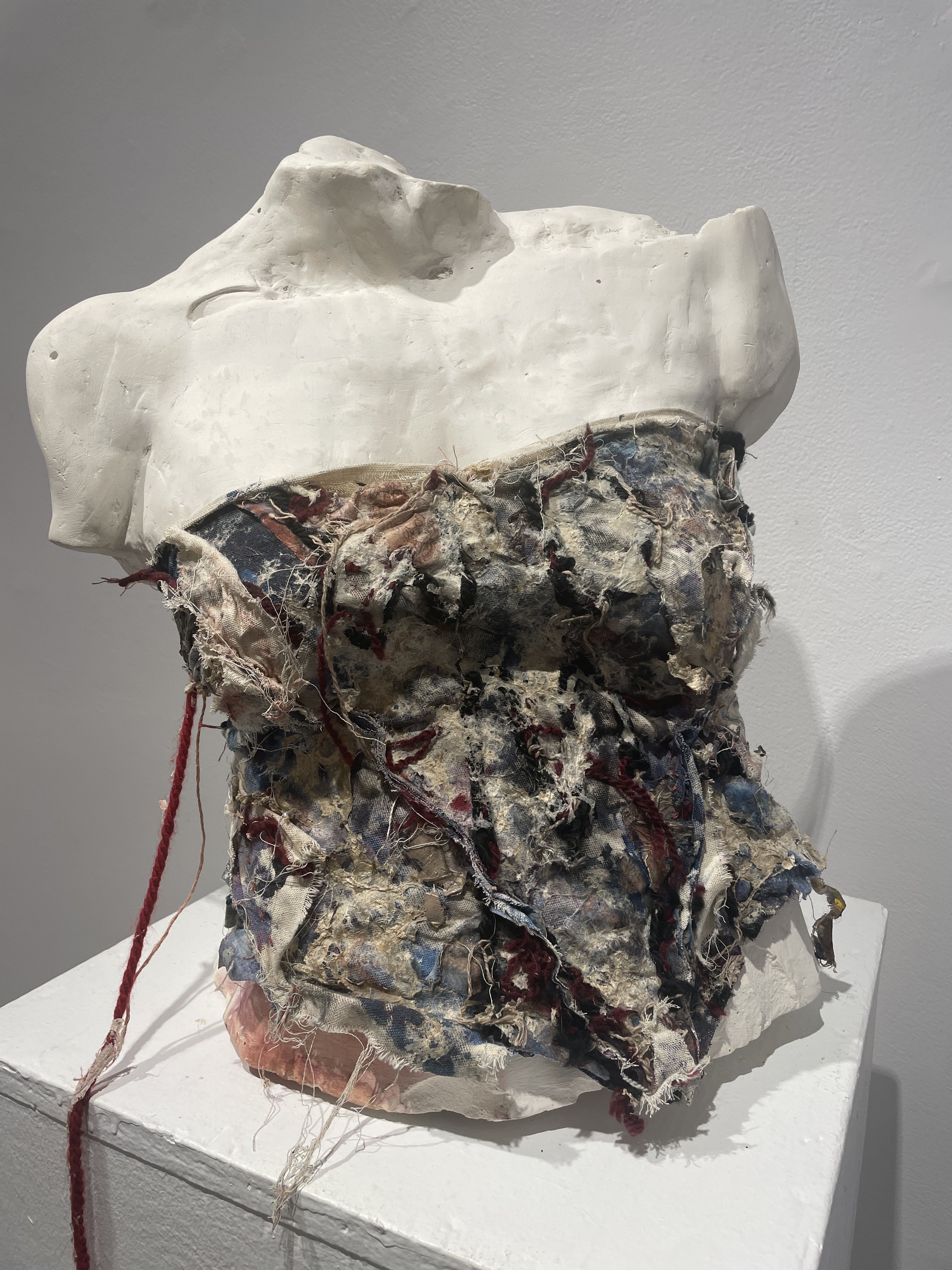 This body of work is the accumulation of five years of artistic practice. In my early works on canvas and paper I explore gender, identity, and representation. Most of the images come from Google searches for the word, “woman.” This Google search quickly leads to pornography. It is intriguing to learn that this gender descriptor is immediately over-sexualized on the internet.. I am interested in how this translates to one’s own explorations of self and gender identity. I am curious about the correlation between the feminine body and its representation, and how this affects one’s physical, mental, and sexual health. It is estimated that over 50 percent of women experience body dysmorphia and over 70% of millennial women admit to disordered eating. Nearly 30% of young girls in the United States inflict self harm. With unreported calculations intact, 80% of women experience sexual assault or harrassment in their lifetime. In Body/Image, visual expressions of these analyzed questions and statistics are layered to create patterns over portraits, fabrics, and collages of collected objects. Across these pieces I look to address the personal within the political, and the individual within the collective narrative.